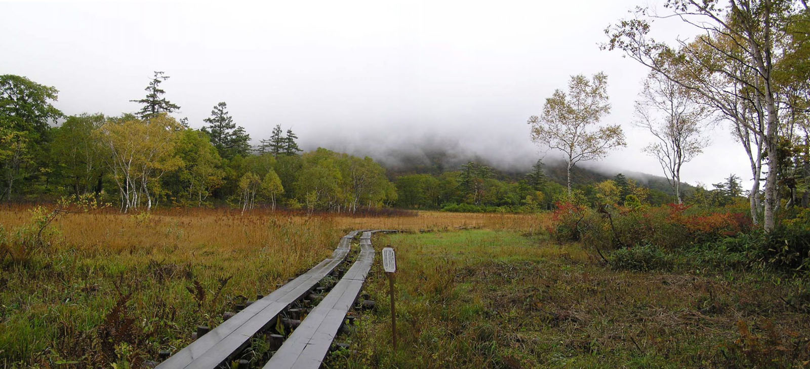 まだ霧雨が降っており、木道は滑りやすく、全体がどんよりしています。